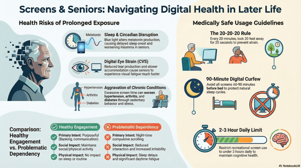 Screen time impacts seniors differently from younger adults due to changes in three major systems: the circadian system, the visual system, and neurocognitive processing. Aging reduces melatonin production, weakens circadian amplitude, and decreases adaptability to light shifts, making even small circadian disruptions from late-night mobile use have larger sleep consequences. The visual system is affected by lens opacity, reduced pupil diameter, slower accommodation, and reduced tear film, leading to faster visual fatigue, strain, and headaches. Neurocognitive processing in older brains is slower, with reduced cognitive reserve and greater vulnerability to sleep loss, amplifying attention problems, memory complaints, and irritability with excessive screen use.
